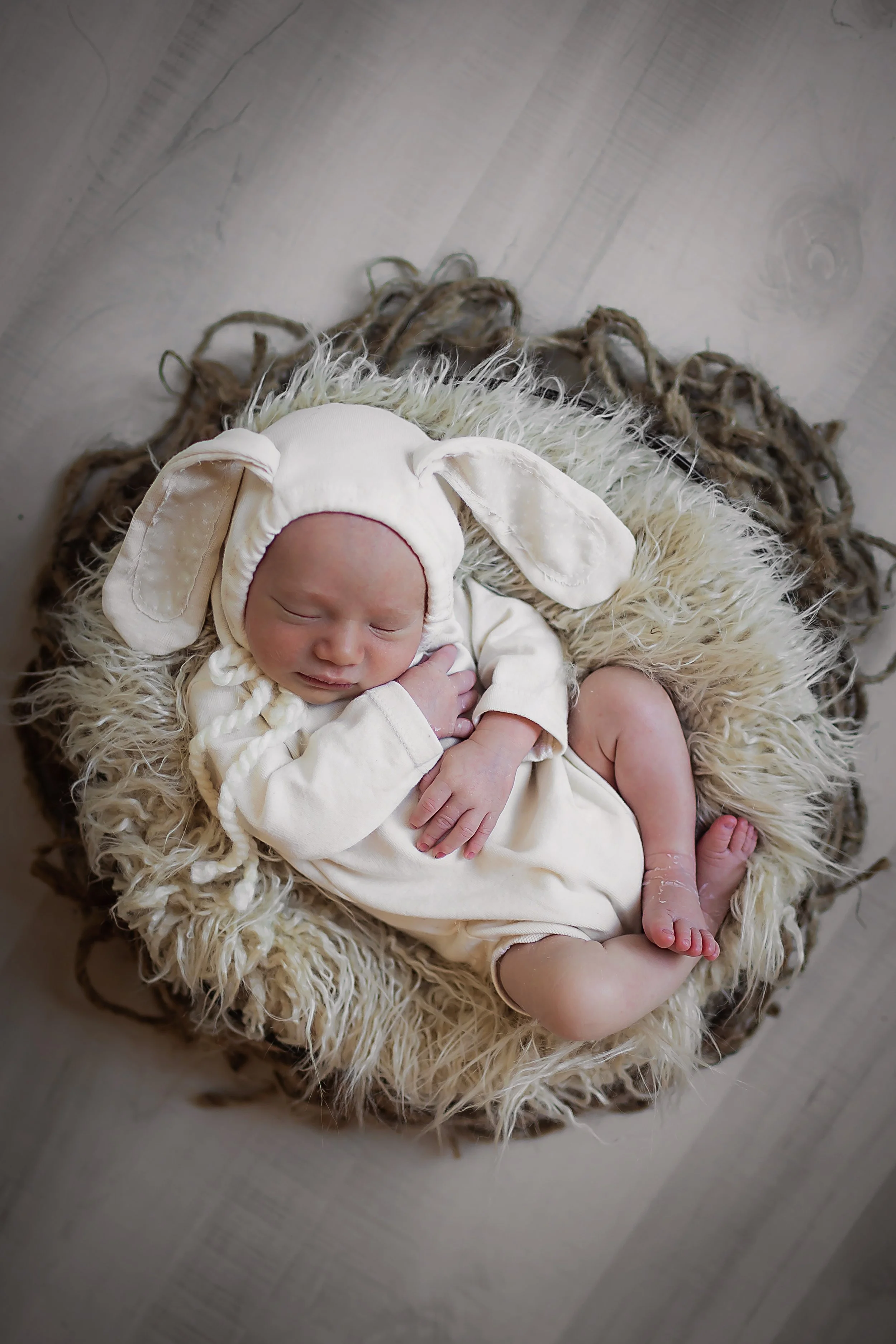 I went to work finding a sweet bunny outfit in which to pose him, and found the perfect newborn bunny outfit from No. 2 Willow Lane.